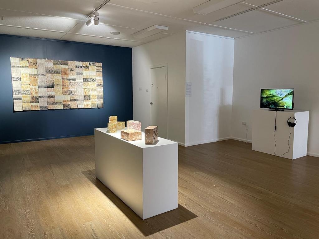 The exhibition at Outback Arts featuring video, soundscapes and 2D/3D work by Kim V. Goldsmith (AUS) and Andrew Howe from our collaborative Mosses and Marshes project moved into Wayilwan country close to Maliyanga Ngurra / Macquarie Marshes. Included new work Whixall Bibles and Bog Sequence using botanical inks, acrylic transfers and rust prints