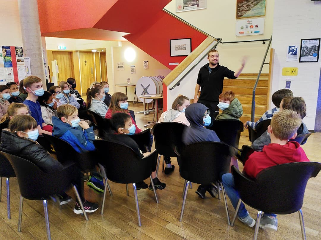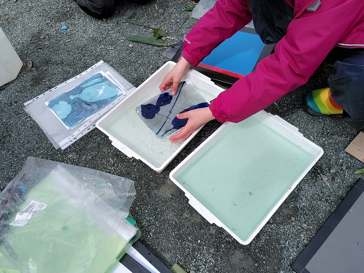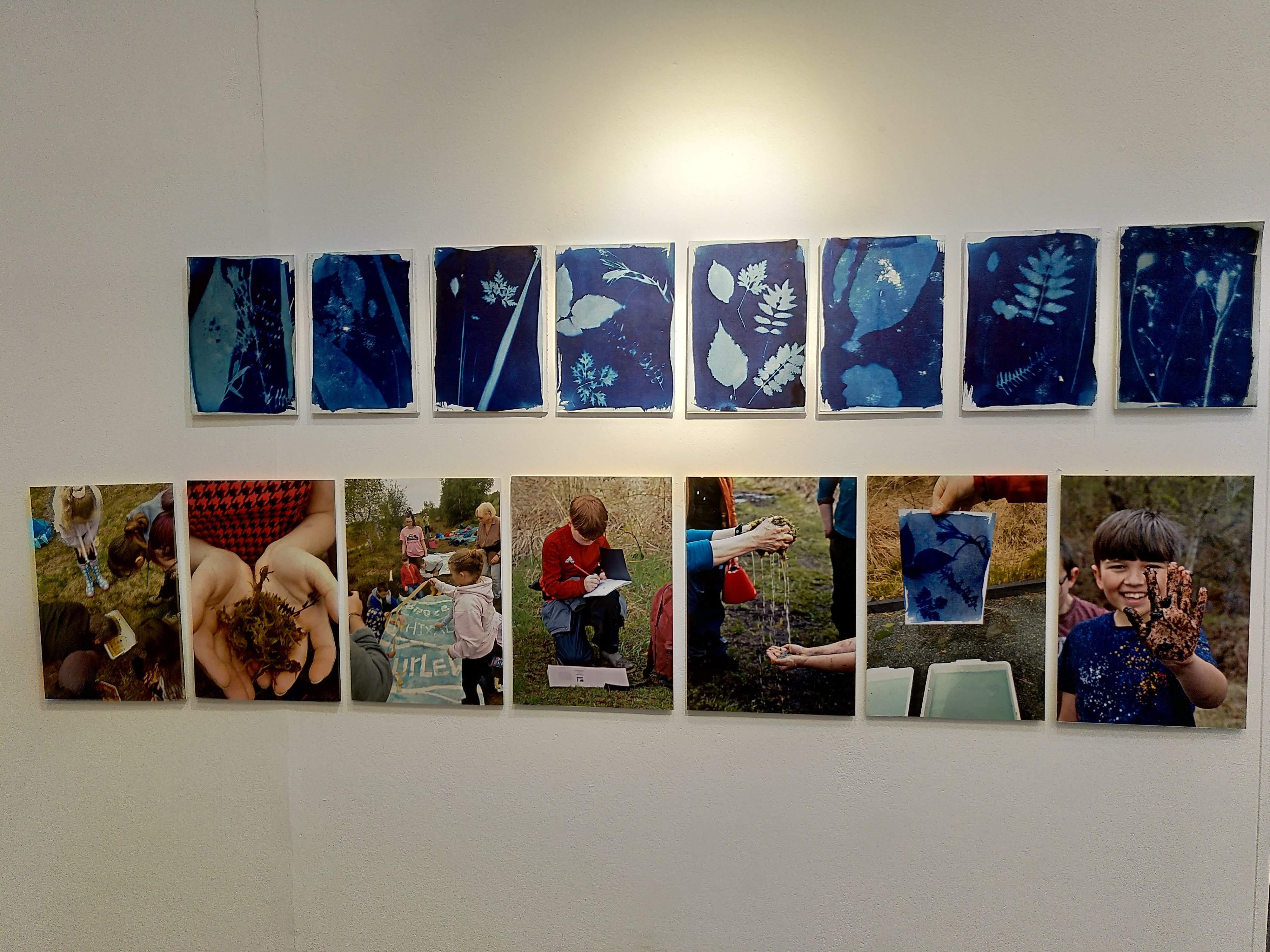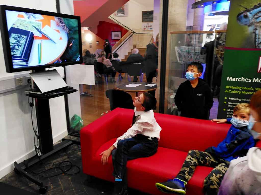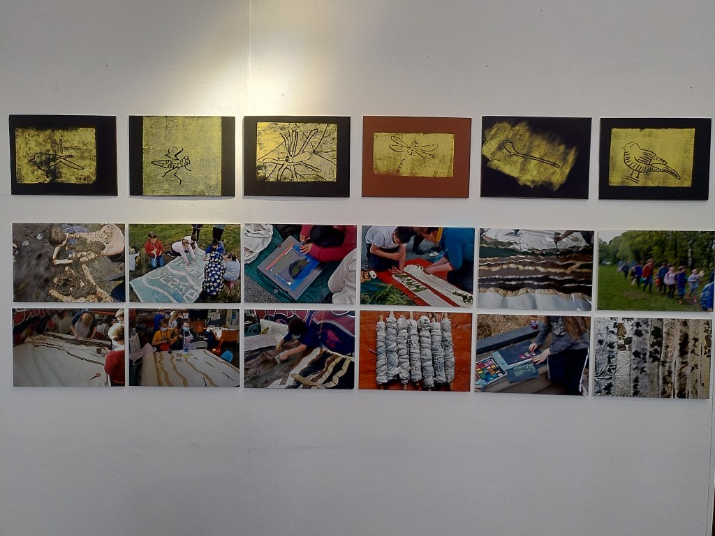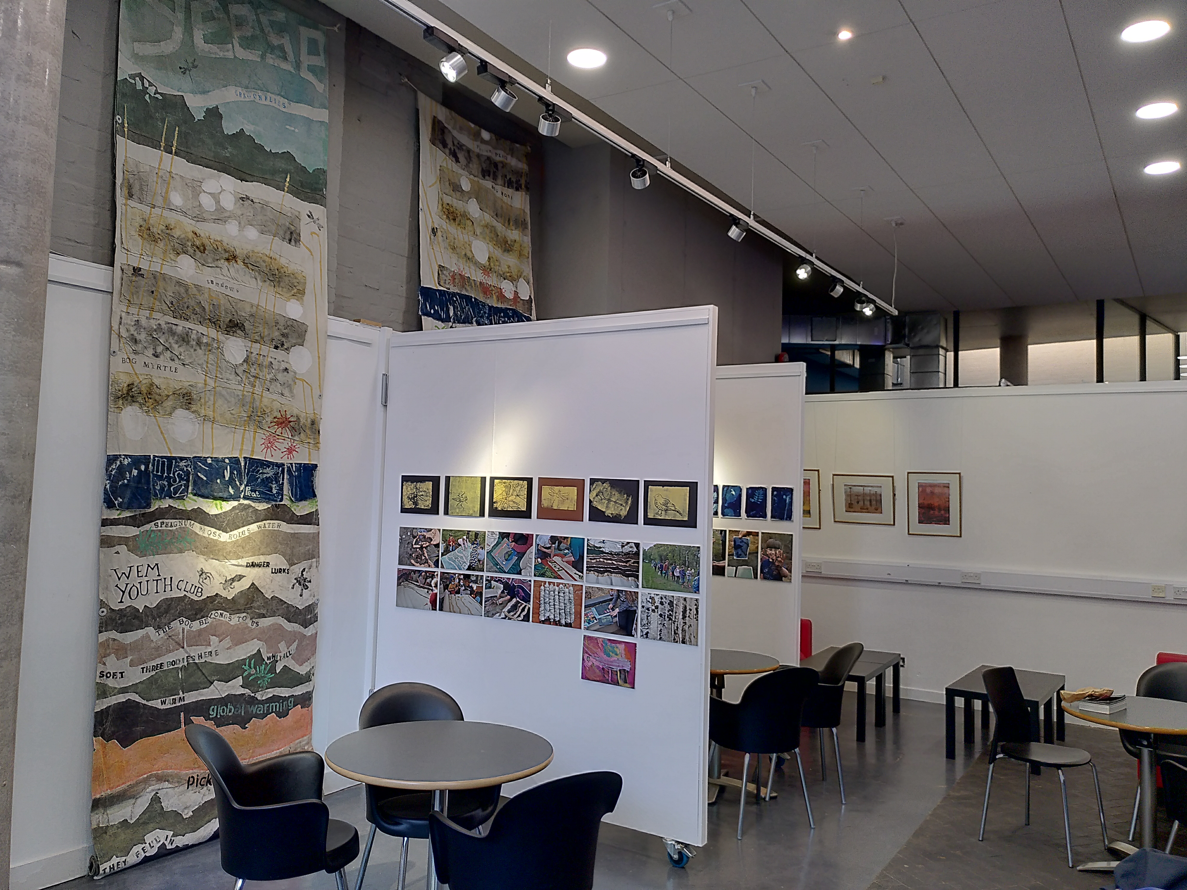 This resulted in three 7m long canvas banners, printed, painted and worked on by Youth Club members and a number of other prints and drawings. The banners were displayed back at Whixall Moss Mammoth viewing platform. The artworks, photographs of the children at work plus some work made by the collaborating artists featured in an exhibition at Wem Town Hall in September/October 2021.