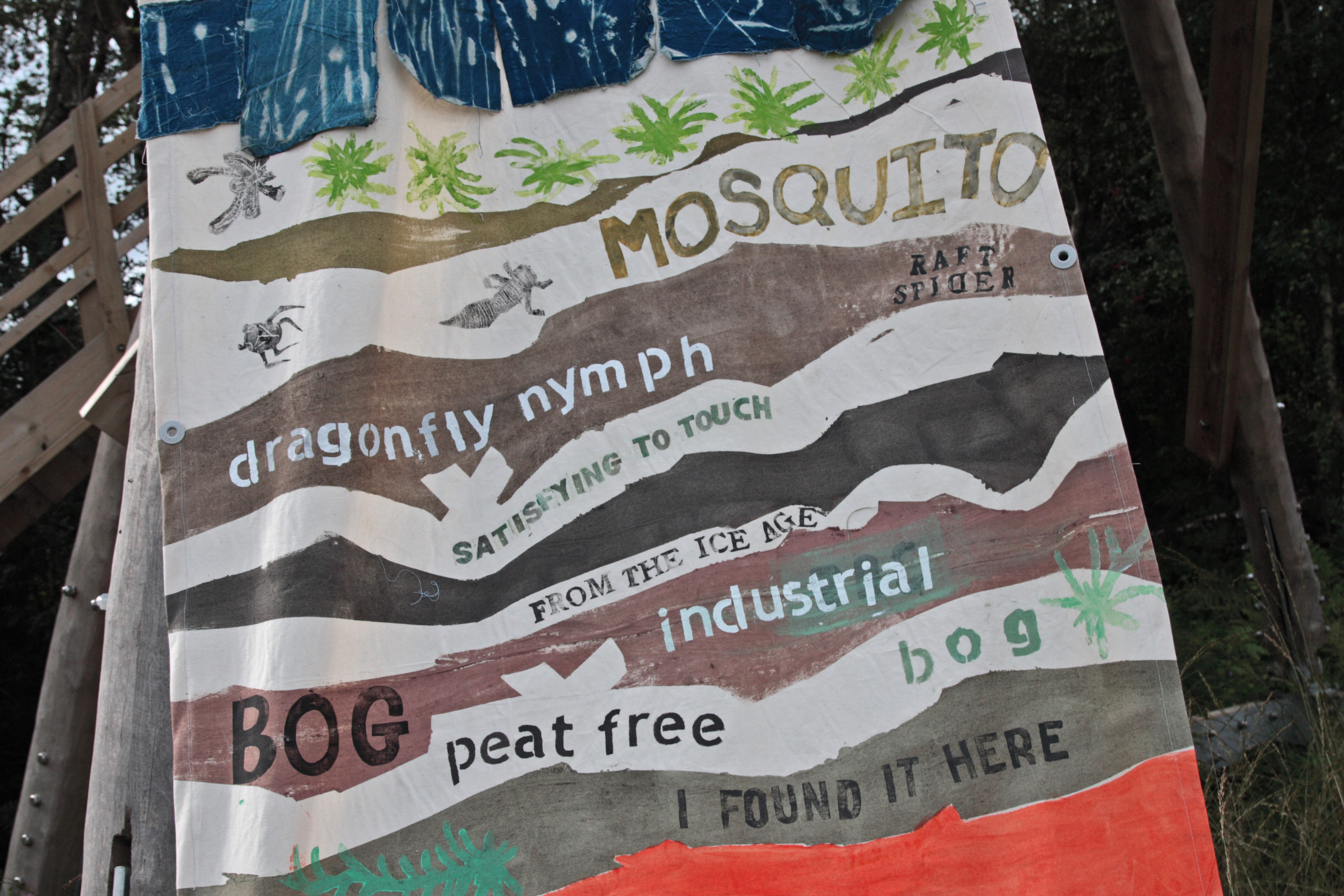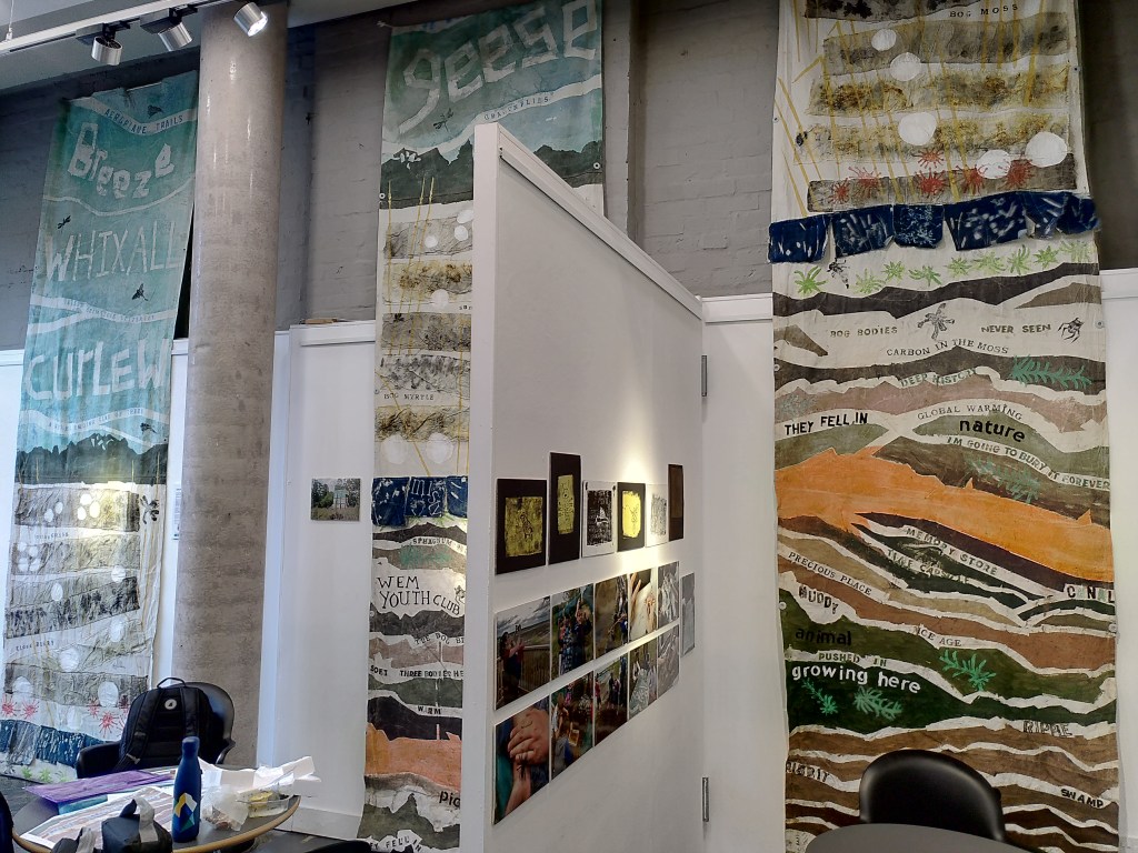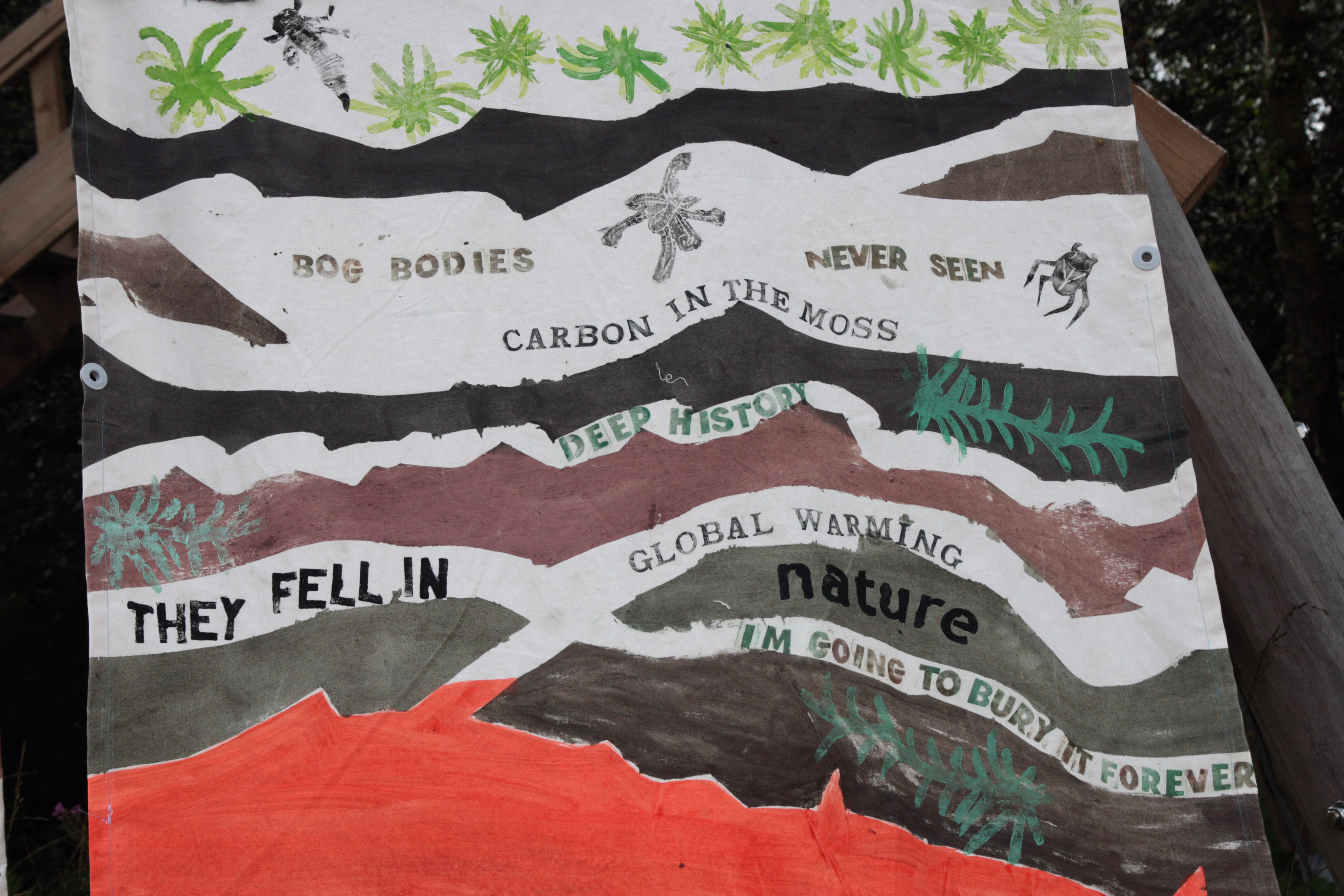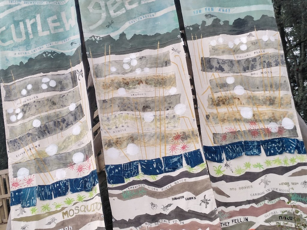 Three 7m long banners incorporate canvas and other fabric painted or dyed using peat and other natural materials gathered at the Moss, eco-printed fabric and cyanotype printing.