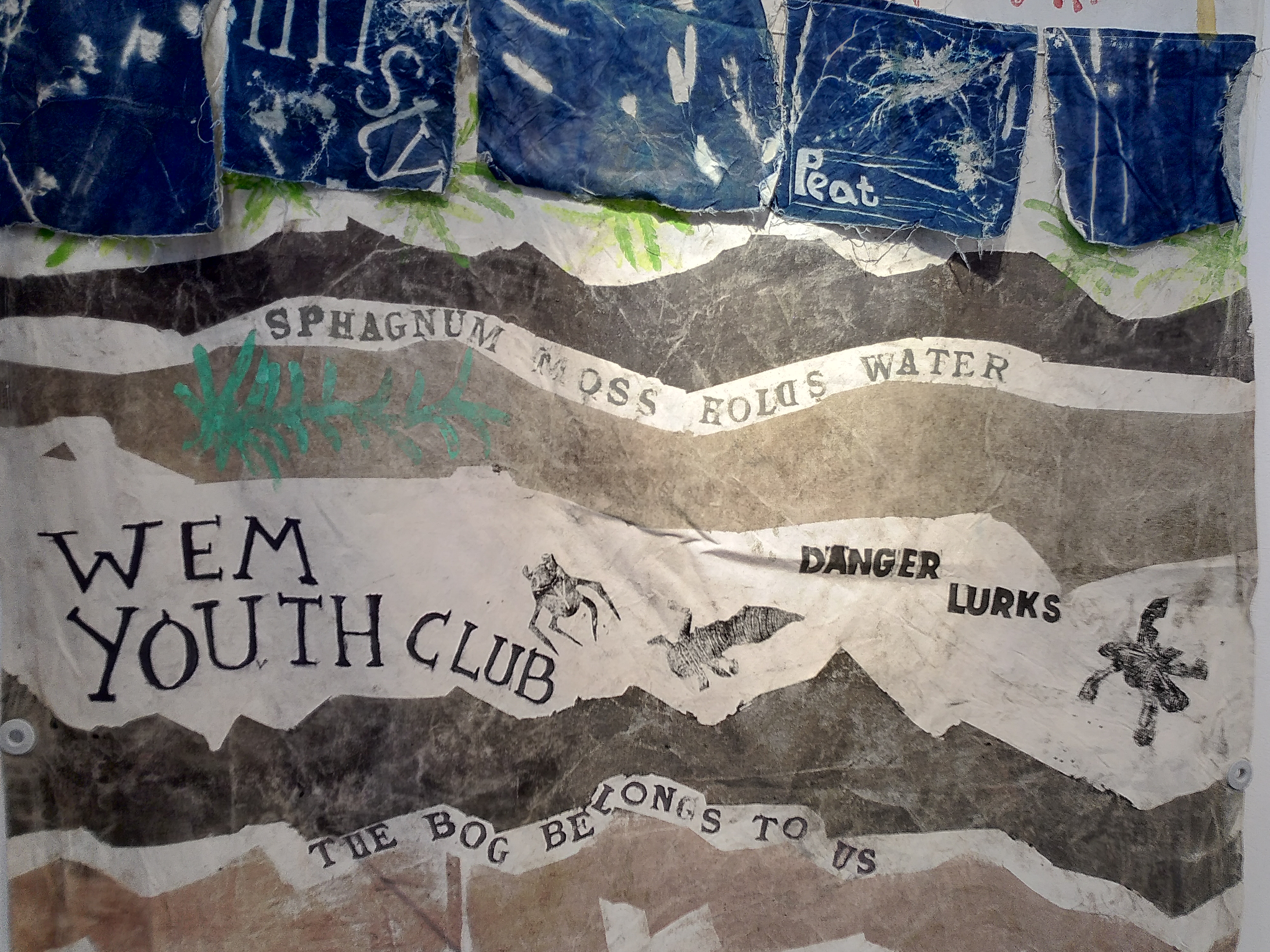 This project grew from an ongoing collaboration between Wem Youth Club, local artists, Shropshire Wildlife Trust and Natural England. A group of children aged 7-16 years from Wem Youth Club made visits to Whixall Moss with artists Sue Challis, Kate Johnston and Andrew Howe, and Anna Martin and Phil Playford from Shropshire Wildlife Trust. They explored and learnt about the Mosses, and created artworks which they continued to work on at the Youth Club in workshops.